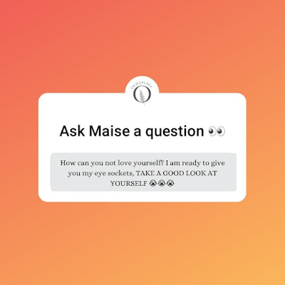 Maise: While I truly appreciate the gesture, I would very much like for you to keep your eye sockets intact. You won’t be able to read this otherwise. I do understand I’m not everyone’s cup of tea, self-love though does not come naturally to me after being scrutinized for every little action since… forever, is not something I lack. I believe I have a harder time accepting others’ positive feelings for me. Surely, they must want something in return, right? Because in my world, that’s how it works. I haven’t had many people who like me without demanding something in return. I’d say I have trust issues rather than self-love issues.