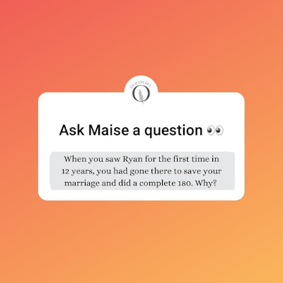 Maise: I always imagined myself saying “I would stop myself from marrying Wayne” or going even further back and say “I wouldn’t go out with Wayne”, but I’ve come to realise what I’d truly like to change. Instead of thinking it is the world against Ryan and me, back in high school, I’d see it as us together trying to navigate through the world. I wouldn’t let my pride or misunderstandings get in the way. If I could fight for the wrong person, couldn’t I have done the same for the right person?