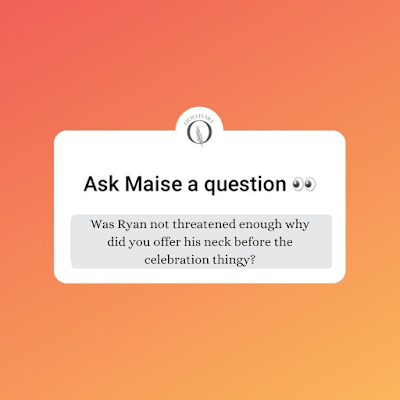 Maise: I never thought he would go ahead and sign a contract with his nemesis. Never even imagined them meeting up. If everyone followed my plan, Ryan wouldn’t have been threatened at all. Yes, I lied to him, but I needed to check if he was trustworthy. You can’t really blame me there. Besides, I wouldn’t have let anything happen to him.